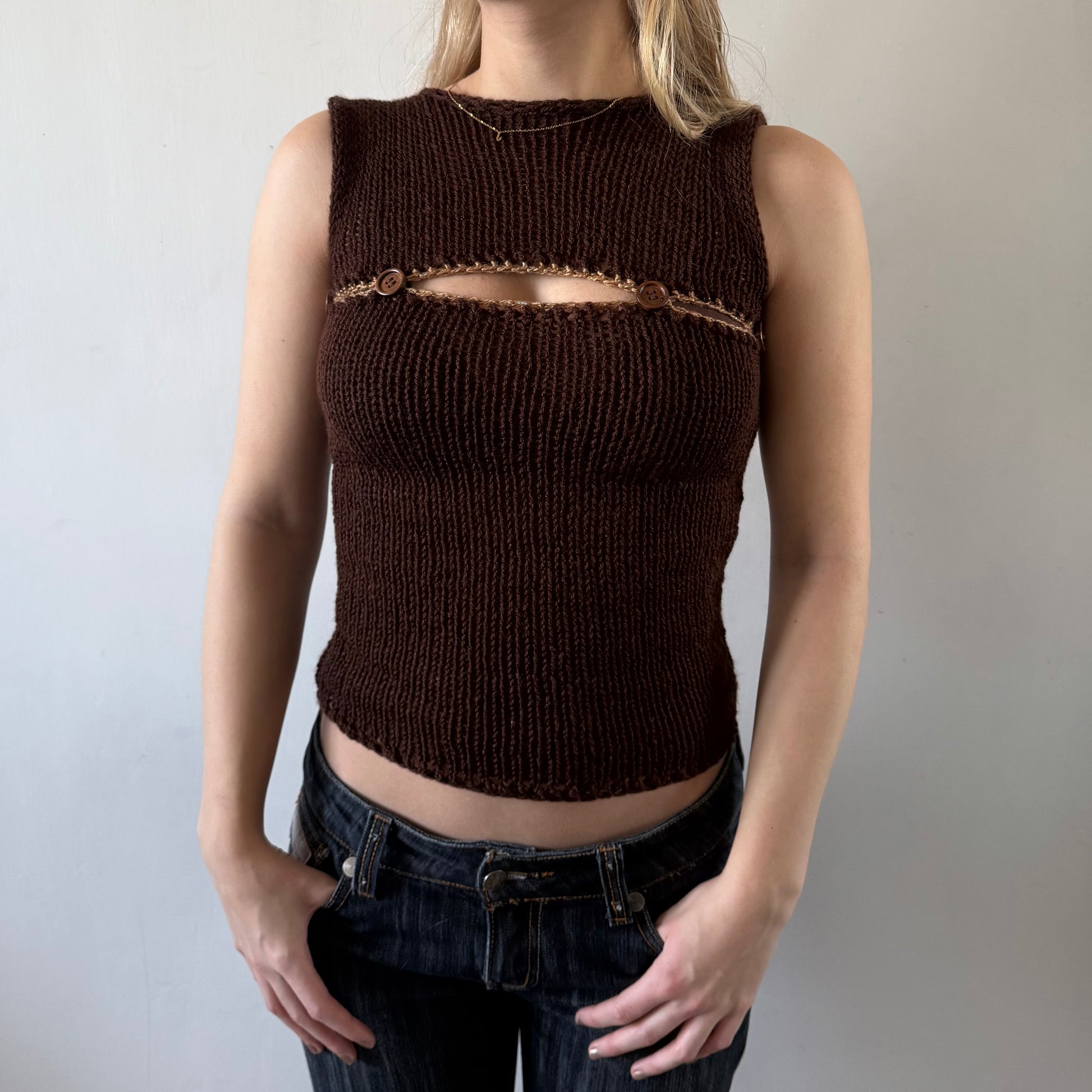 This top is a brown slightly cropped top, with a cut out design, embellished with gold stitching and brown buttons.